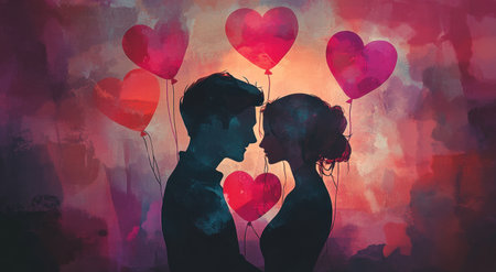 A couple in love, their silhouettes intertwined with heart-shaped balloons, their faces illuminated by the soft glow of romantic lighting, creating an atmosphere filled with warmth and tenderness, in the style of a watercolor illustration with pastel colors, digital art medium, vector graphics. --ar 47:26 --v 6.1 Job ID: bedb280a-8fe4-44e3-860e-419e85aeca36