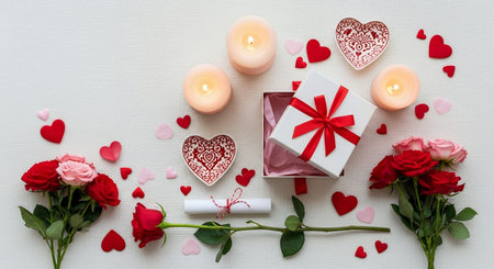 Valentine's day background with gift box, candles, hearts and roses