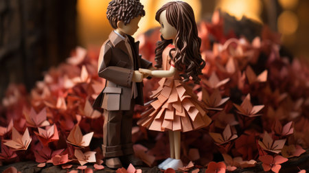 A charming scene featuring wooden figurines of a couple surrounded by roses and warm lights, evoking love and togetherness.