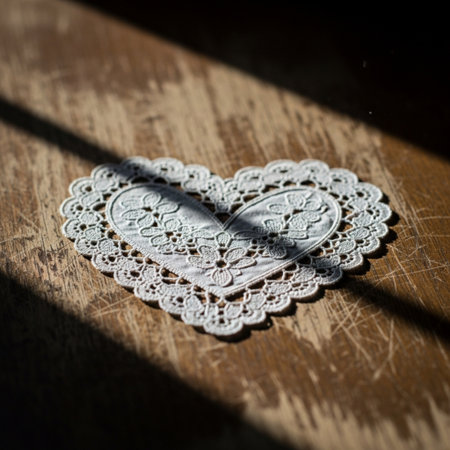 Tilted, cinematic close-up of a dusty, heart-shaped vintage lace doily under harsh window light.