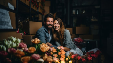 Portrait of a young couple in love looking at camera while sitting in a flower shop