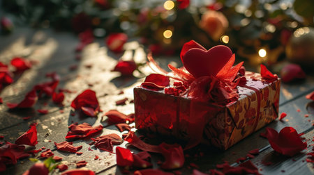 Valentines Day background with red gift box and rose petals