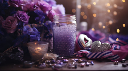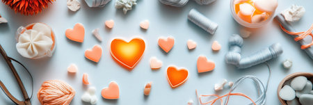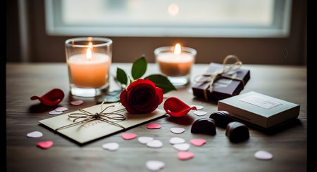 A wooden table adorned with heart-shaped decorations, candles, and other romantic elements, creating a cozy and intimate atmosphere for a special occasion or celebration.