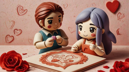 A delightful Valentine's Day image showcasing two adorable cartoon figures with a heartfelt card and red roses. The scene is set against a pink backdrop adorned with heart drawings, evoking a sweet and romantic atmosphere.