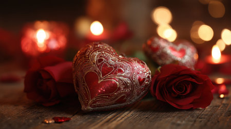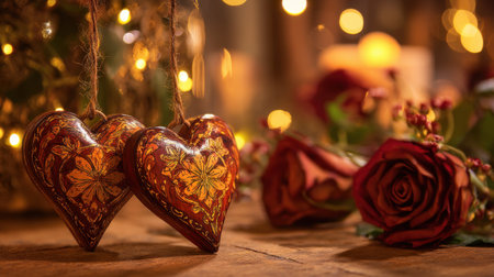 Two intricately designed heart decorations hang next to lush red roses, illuminated by soft candlelight, creating a romantic, cozy atmosphere perfect for special moments.