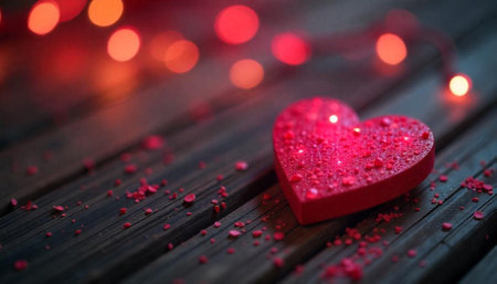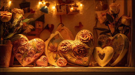 Beautiful heart-shaped decorative items adorned with roses, illuminated by warm lights, ideal for romantic settings and home decoration.