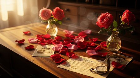 A warm, sunlit wooden desk is adorned with two glass vases holding red and pink roses. Scattered red and pink rose petals are strewn across the surface, interspersed with vintage photographs, a handwritten letter, and a pocket watch. The scene is bathed in soft, diffused light with noticeable bokeh, creating a romantic and nostalgic atmosphere, conveying themes of love and memory.