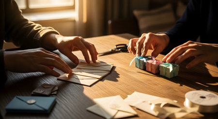 Two pairs of hands working together at a wooden table, organizing small pastel-colored gift boxes and envelopes. The scene is illuminated by warm sunlight, suggesting a preparation for a wedding, celebration, or holiday.