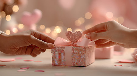 Delicate hands elegantly exchanging a sparkling pink gift box adorned with a heart-shaped decoration, evoking feelings of love and romance in a soft setting.