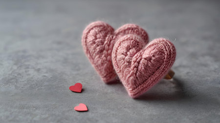 Red and pink knitted hearts creating a romantic valentine's day banner with copy space on a pink background