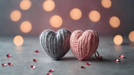 The banner. Background for Valentine's Day. Knitted hearts with festive lights in the form of a side in the background. a mock-up of an invitation card for a Valentine's Day party, a place to copy.
