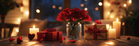 A classic Valentine's Day scene with a stylish table setting, including a vase of vibrant red roses, flickering candles and a ribbon-tied gift box, perfect for a romantic celebration, banner