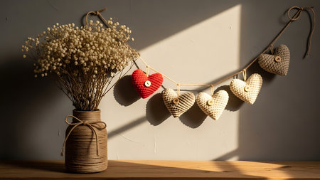 Hand-knitted neutral and red hearts hanging on a twine rope next to a vase of white baby's breath flowers in warm sunlight.