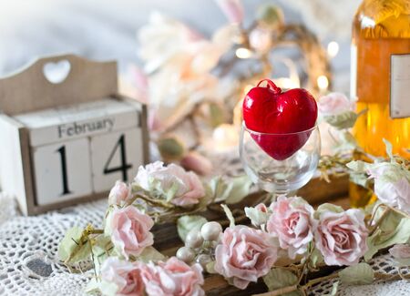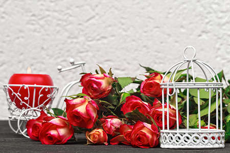 Bouquet of roses, candles and gifts, card for February 14, St. Valentine, March 8, wedding, birthday, mother's day, blurred background, bokeh.