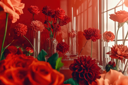 Vibrant red and pink roses and dahlias in elegant glass vases.