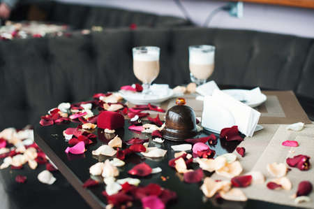 Two cups of coffee on a table strewn with petals. The guy just confessed his love to his girlfriend