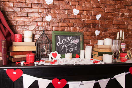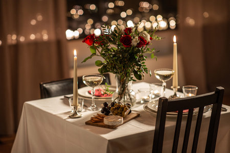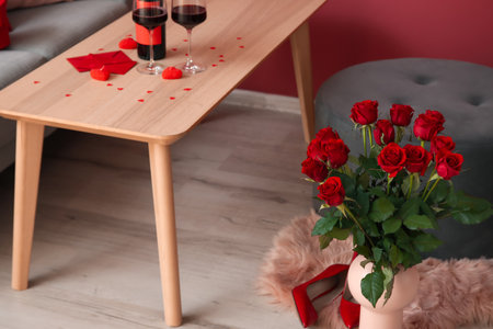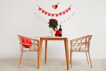 Interior of dining room decorated for Valentine's Day with table and roses in vase