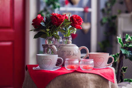 Table with vases of red rose, tea cups and teapot. Red door entrance to house