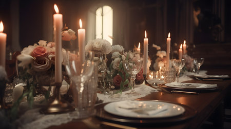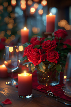 A romantic table setting with red roses, candles, and warm lighting. Perfect for a Valentine's Day dinner.
