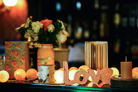 Word Love from wooden candlesticks on the festive table of the bride and groom.