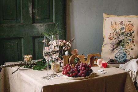 st. Valentines day or wedding romantic table setting with wooden letters love, needle felted hearts, bouquet of pink roses, couple glasses of champagne and red grapes on natural linen tablecloth.