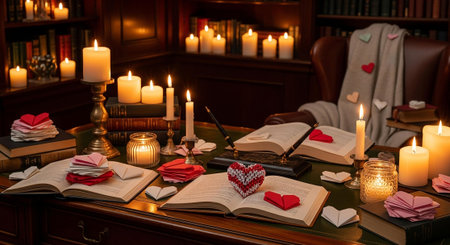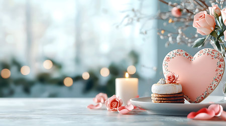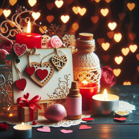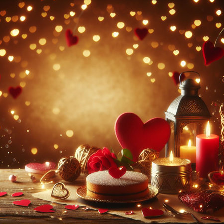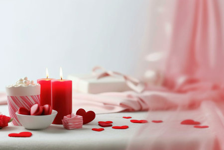 Romantic Valentine's Day scene with red candles, hearts, and sweet treats. Perfect for a cozy and intimate celebration.