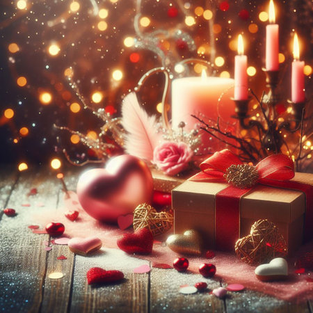 Intimate valentine's scene with shimmering red hearts, wrapped gifts with bows, glowing candle and two glasses of red wine on a cozy wooden table for a romantic celebration