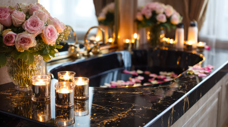 A sophisticated bathing space adorned with fresh blooms and soft candlelight, showcasing a sleek black marble tub that exudes opulence and tranquility.
