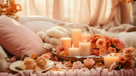 Romantic bedroom decor with candles and flowers. Interior design with warm lighting and soft colors for a cozy and intimate atmosphere.