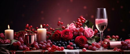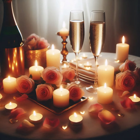 A still life photo of a romantic setting with roses, candles, and a glass of champagne.