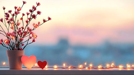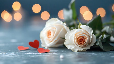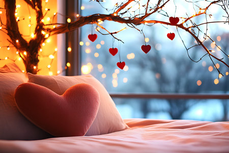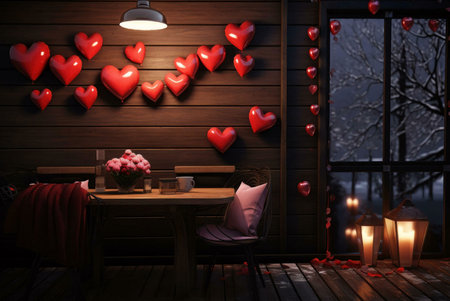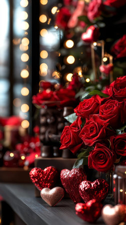 Romantic valentine's day decor with red roses and heart-shaped ornaments in a warm, glowing light. concept of love, celebration, romantic atmosphere.