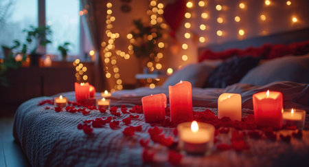 A romantic bedroom scene, filled with candles, roses, and soft lighting, creating a serene and intimate atmosphere.