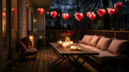 A romantic Valentine's Day dinner setting with red heart balloons, candles, and flowers. Cozy and intimate atmosphere.
