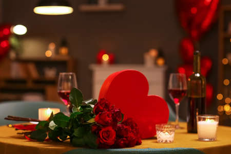 Festive Valentine,s arrangement with champagne glasses, ice bucket, candles, roses and gift box on rustic wooden table.