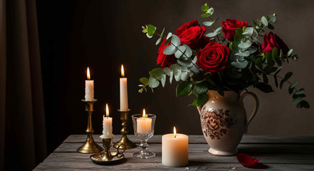 Still life with red roses, candles and eucalyptus branches on wooden table