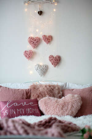 Love sign and valentine decorated bed with pillows, hearts and lights, stylish decoration