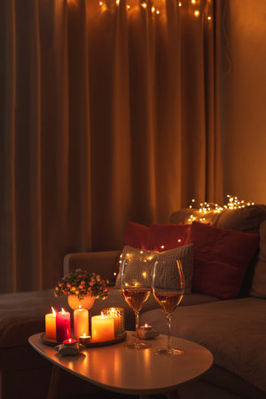 Cozy Evening Scene with Candlelit Roses and Heart-Shaped Lights in a Modern Living Room. Concept of Romantic Ambiance, Relaxation, Warmth, and Intimate Home Decor.. Valentine's Day.