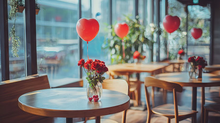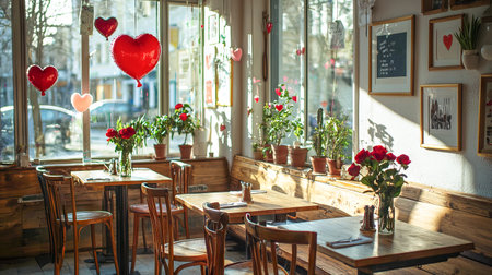 Cozy Modern Cafe with Heart-Shaped Balloons and Sunlit Wooden Decor. Concept of Romantic Atmosphere, Relaxing Social Spaces, Morning Ambiance. Valentine's Day.