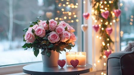 Elegant Modern Living Room with Pink Roses, Candles, and Heart Decorations by the Window - Concept of Cozy Home, Romantic Atmosphere, Winter Relaxation. Valentine's Day.