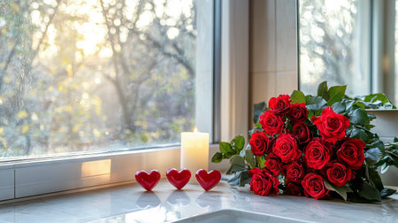 Cozy Sunlit Window Scene with Red Roses, Hearts, and Candle Invoking Romance and Tranquility. Valentine's Day. Copy space.