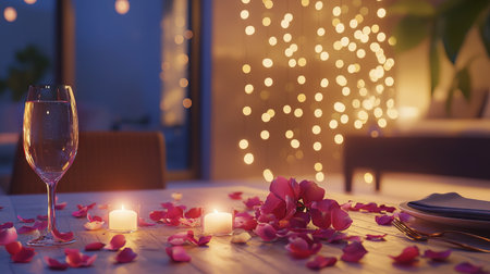 Romantic Table Setting with Rose Petals and Candlelight in Modern Airy Room, Concept of Intimate Dining, Elegant Decor, Evening Ambiance. Valentine's Day.