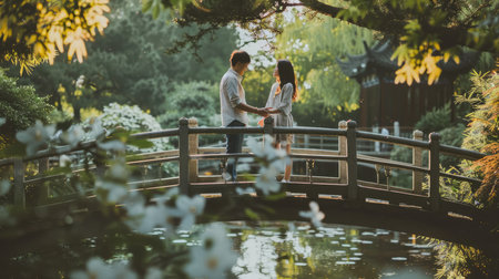 Boy and girl couple standing on semicircular bridge in park, AI generated Image