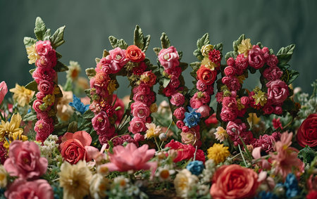 A stunning display of colorful flowers intricately arranged to form the number 50, radiating joy and celebration. The composition features a mix of pink, blue, and orange blooms, symbolizing a vibrant milestone filled with beauty and life.