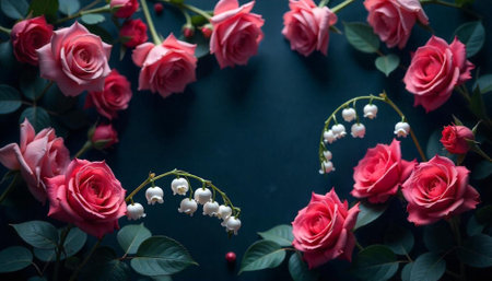Luxurious flat lay of red roses with a velvet ribbon on a rich fabric background