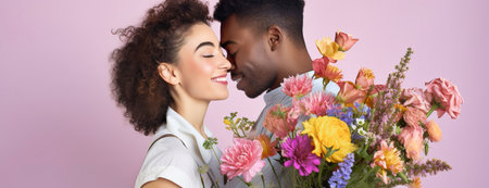 Side view of multiethnic couple kissing each other with bouquet of flowers over pink background with copy space