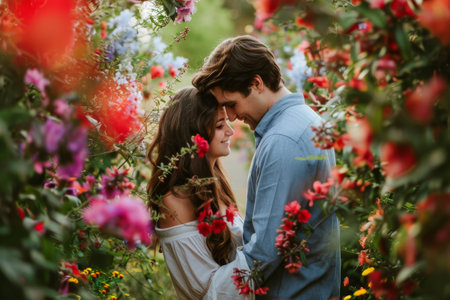 A husband and wife sharing a tender moment in their garden, surrounded by blooming flowers.AI generated