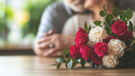 Romantic bouquet of red and white roses with elderly couple in background Concept of Valentine's Day love romance and floral arrangement in elegant setting. Copy space.
