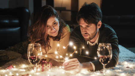 A romantic young couple shares a joyful moment under soft fairy lights during a cozy evening. Their laughter and playful expressions create a heartwarming atmosphere of love and connection.