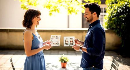 Young couple playing cards on the terrace of the house. Concept of love and marriage.