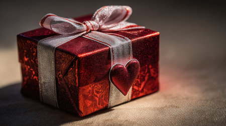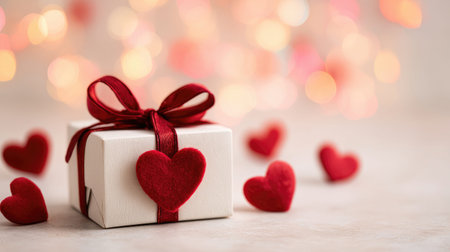 Delightful gift box with a striking red ribbon and heart-shaped accent, surrounded by soft confetti, perfect for romantic occasions and celebrations of love.